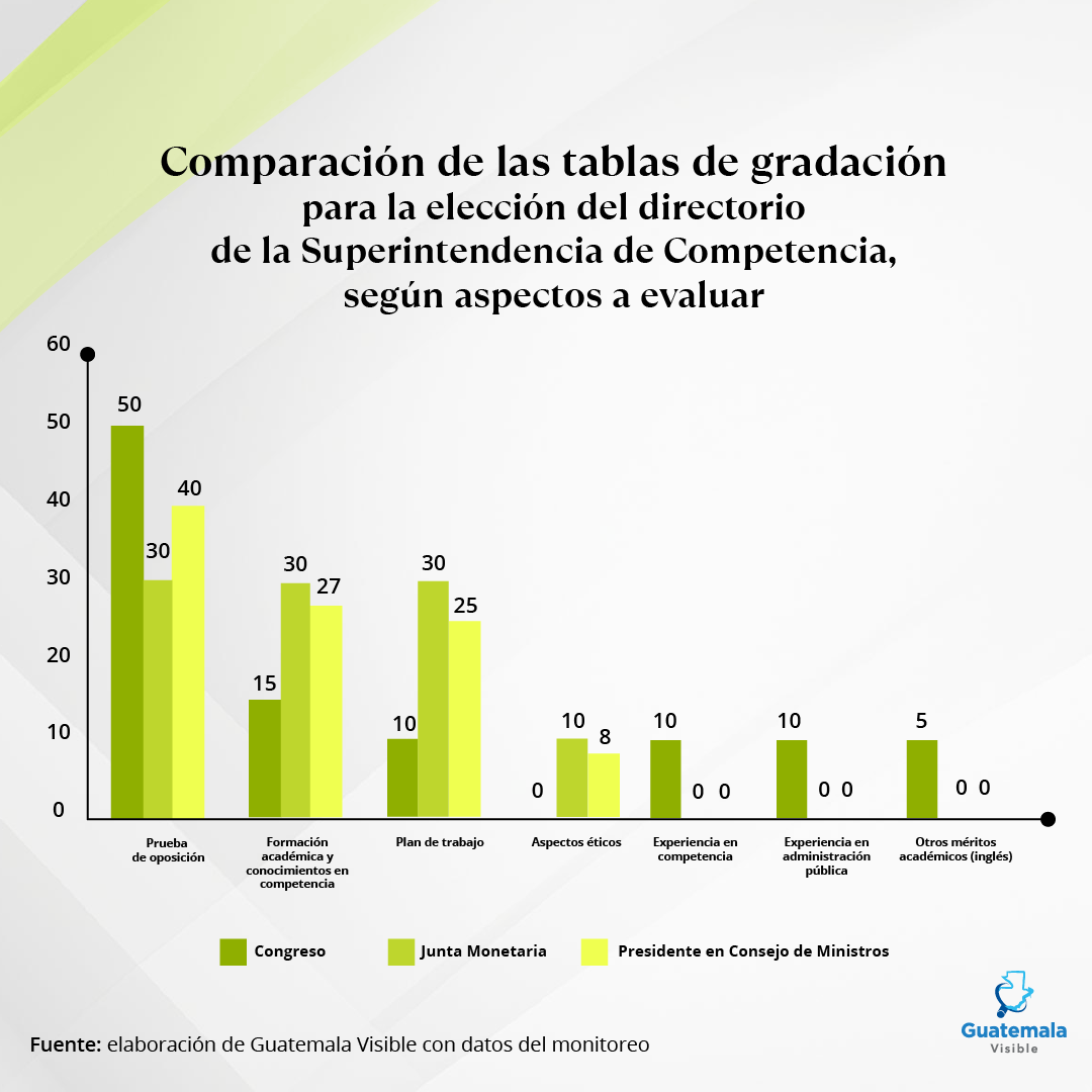 Para el análisis, se unificaron los aspectos de formación académica y conocimientos en competencia debido a la distribución específica del puntaje en cada entidad. Por ejemplo, la Junta Monetaria otorga 5 puntos por la maestría y 5 puntos por el doctorado, sumando un total de 10 puntos para la formación académica y 20 puntos para los conocimientos en competencia, alcanzando un total de 30 puntos. El presidente en Consejo de Ministros asigna 10 puntos a la formación académica y 17 puntos a los conocimientos en competencia, lo que da un total de 27 puntos. Por su parte, el Congreso distribuyó los 15 puntos asignados de la siguiente manera: 5 puntos para la licenciatura, 10 puntos para licenciaturas en Economía, Ciencias Jurídicas y Sociales, Administración o Ingeniería Industrial, y 15 puntos para una Maestría o Doctorado en materia económica, Finanzas o Competencia, sin acumulación de puntajes.